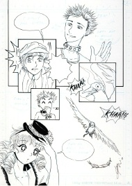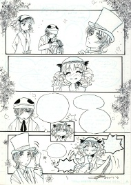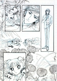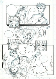 These are original manga layout pages hand drawn by Tavi on A-4 Deleter manga layout paper using Pilot Color Eno light blue pencil, then inked with .005 Sakura Pigma Micron Pens. The layouts are scanned, and Rikki applies the screentones and lettering using Photoshop. The finished layout is then sent over to the editor.